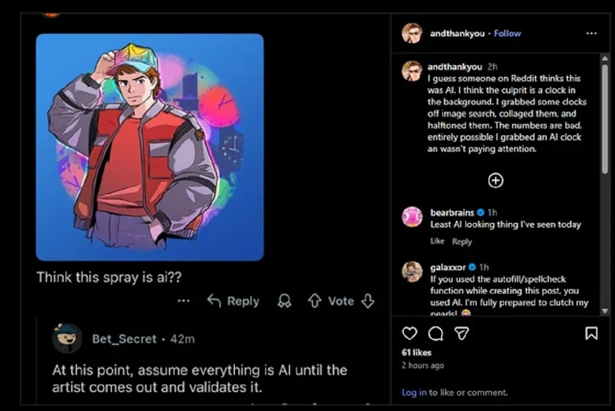 А вот граффити с Марти из «Назад в будущее» — это всё же авторская работа. Но художник признаётся, что часы на фоне он нашёл в сети, и они могли быть сгенерированы.