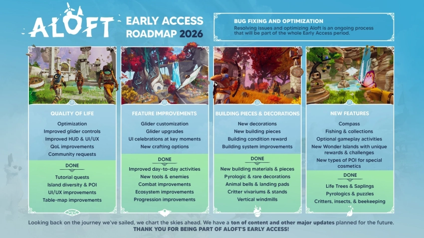 А уже 12 февраля небесных капитанов ждёт крупное обновление Gliders & Gales. В нём сделают акцент на полётах на планерах с множеством испытаний и возможностями для кастомизации. В целом же на 2026 год разработчики наметили следующие важные обновления: