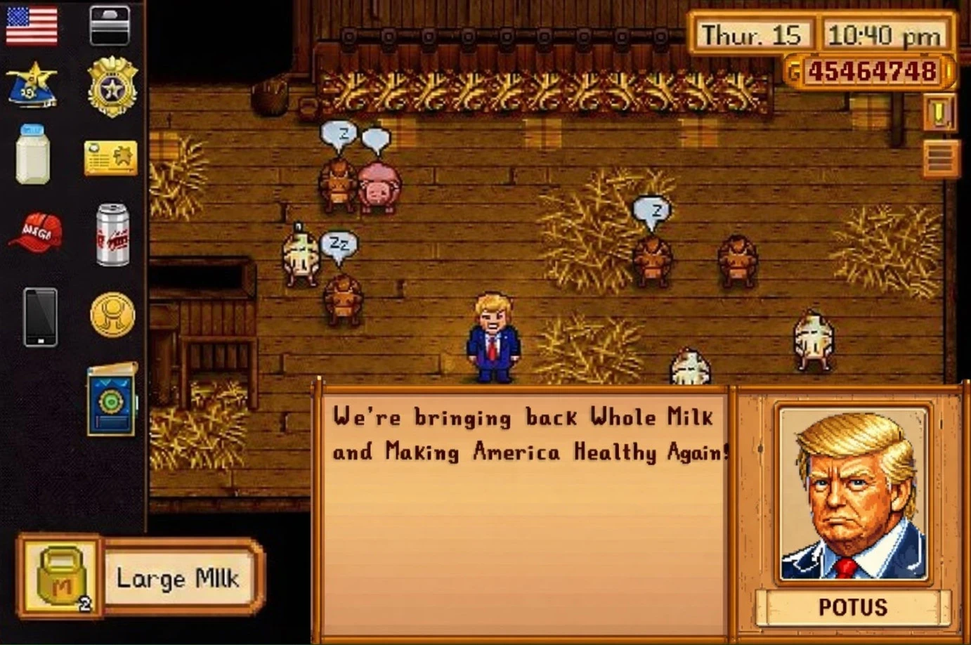Обложка: Дональд Трамп в образе фермераАдминистрация США продолжает заигрывать с аудиторией геймеров. На сей раз официальный аккаунт Белого дома в социальных сетях поделился изображением президента Дональда Трампа в мире Stardew Valley. Политик, стоящий в амбаре посреди коров, обещает сделать свою страну «снова здоровой» за счёт добычи цельного молока.