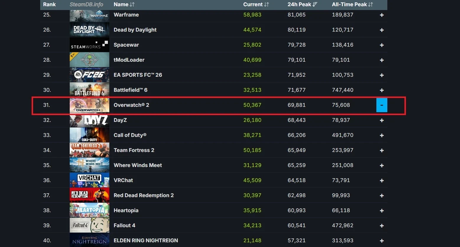 Как видно на скриншоте ниже, суточный пик онлайна Overwatch обошёл DayZ и Call of Duty, но не Battlefield 6. При этом последняя уступает шутеру Blizzard Entertainment по текущему количеству игроков.