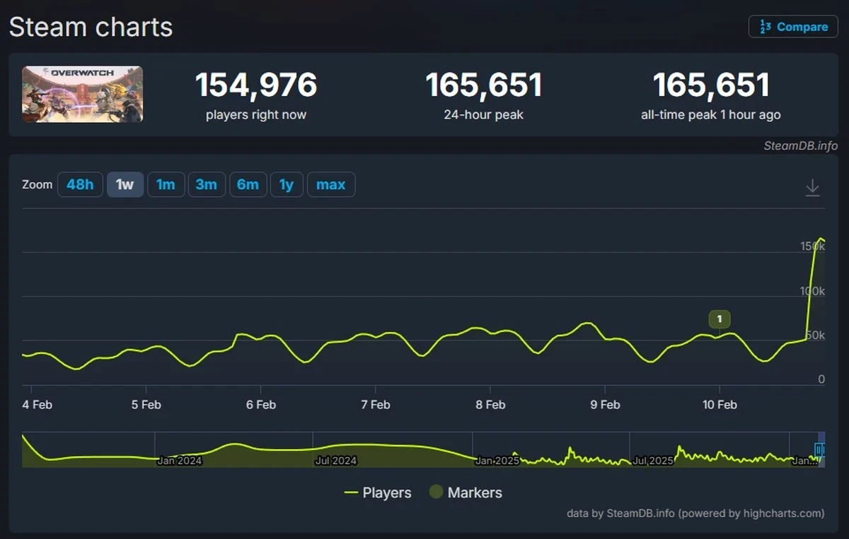 Обложка: скриншот OverwatchOverwatch (2023), перезапущенная вчера, вызвала нешуточный ажиотаж среди игроков в Steam. Что в свою очередь привело к новому рекорду пикового онлайна — на момент публикации новости он составляет 165,651 одновременных пользователя.
