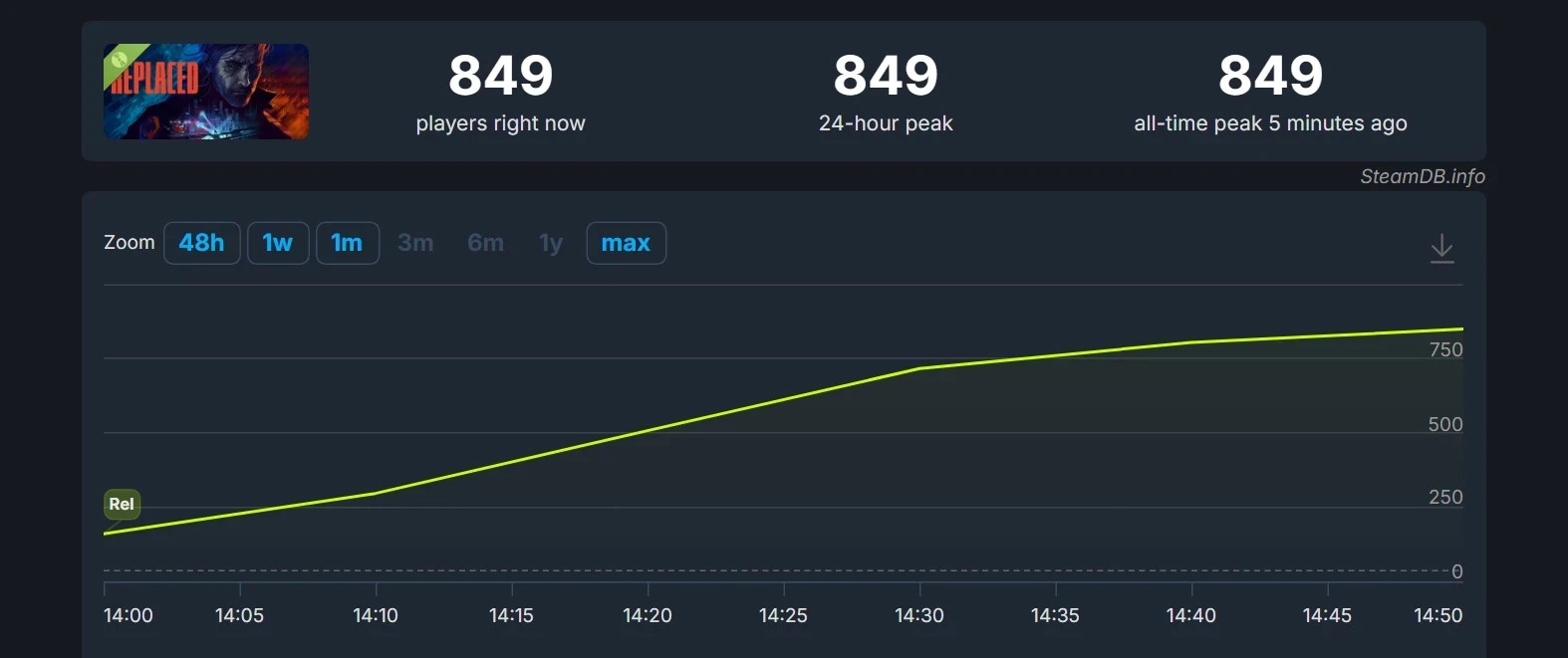 Говорить о каких-то успехах ещё рано, но в первый час пиковый онлайн демоверсии составил 849 человек. Число должно вырасти в ближайшее время, особенно с учётом того, что Replaced добавили в свой список желаемого более 600 тысяч игроков.