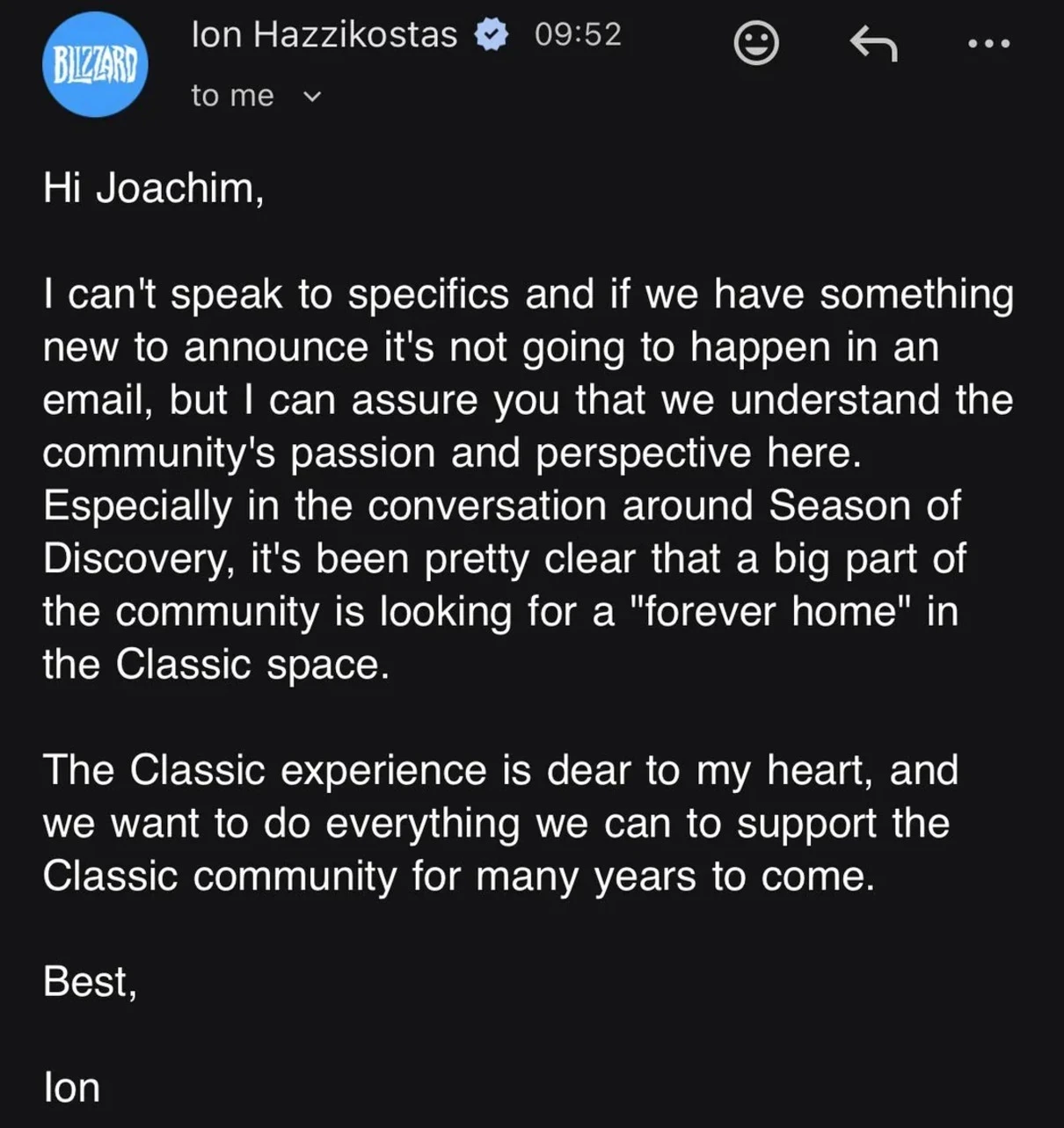 Обложка: скриншот World of WarcraftГеймдиректор World of Warcraft Ион Хаззикостас ответил на письмо фаната, обеспокоенного судьбой World of Warcraft Classic. Игрок написал разработчику без особой надежды на какую-то реакцию и был приятно удивлён, когда нашёл на почте ответ.