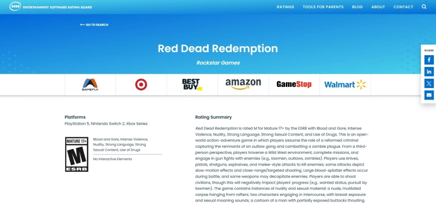 Что касается возрастного рейтинга, то в описании к нему нет ничего интересного. Red Dead Redemption для PlayStation 5, Nintendo Switch 2 и Xbox Series так и осталась игрой «только для взрослых» из-за насилия, крови, нецензурной брани, «обнажёнки» и других элементов, которыми славятся игры Rockstar Games.