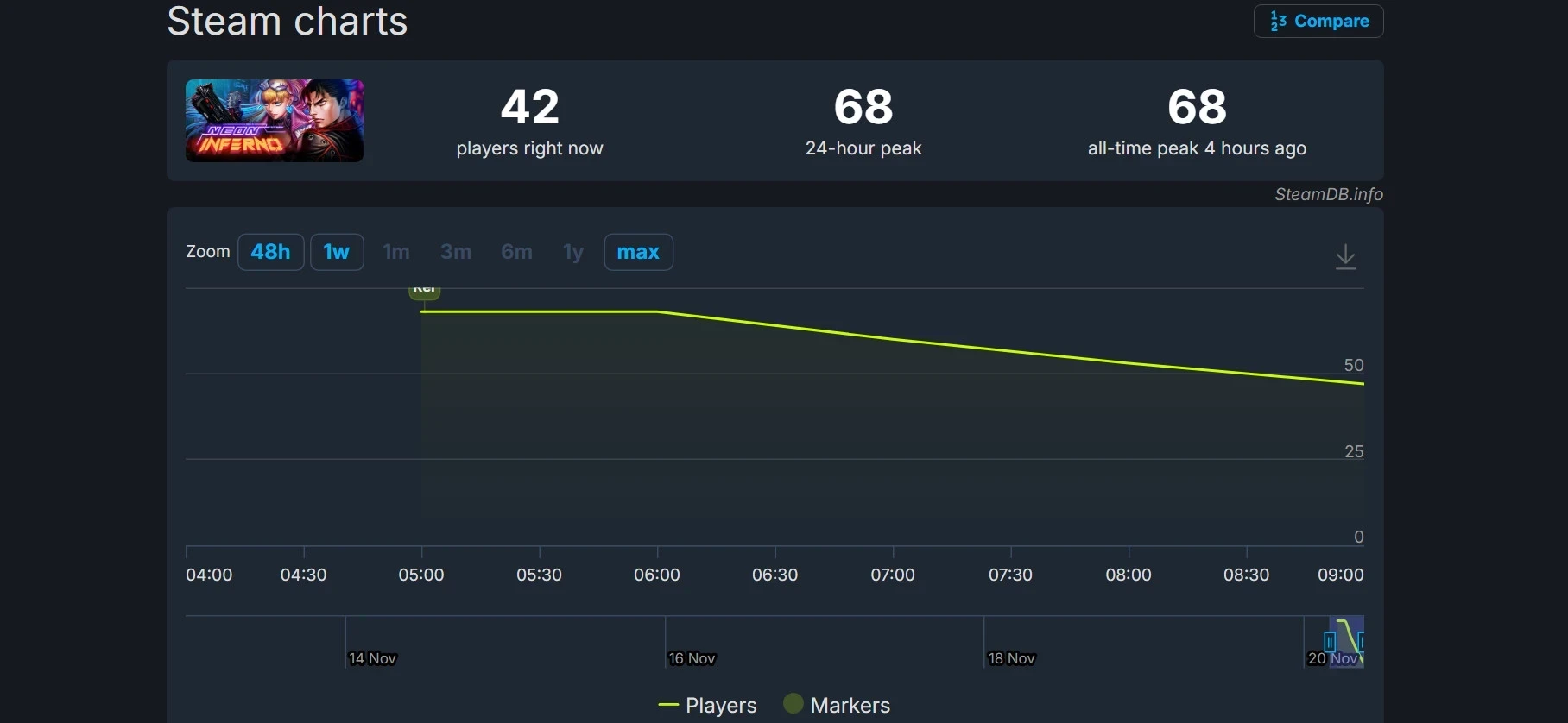 Онлайн Neon Inferno в Steam не может похвастаться высокими показателями. Он составил 68 человек вскоре после релиза игры. Не исключено, что ближе к вечеру ситуация станет лучше.